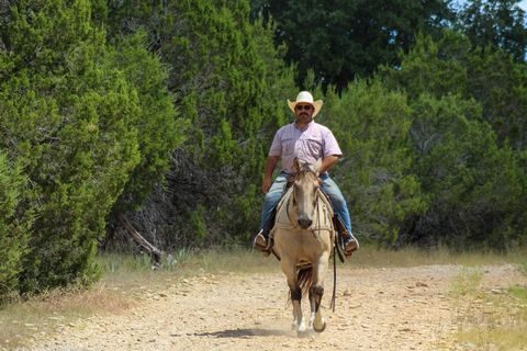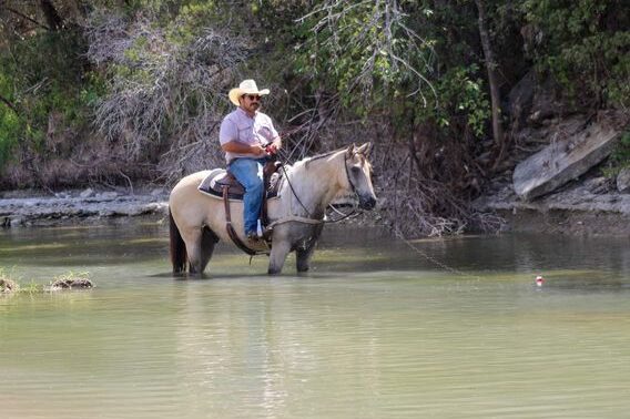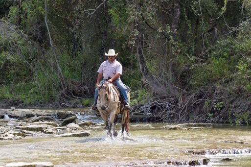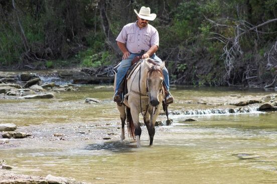 done playday events. He loves to be groomed and get attention. He’s easy to catch in a pasture or he’s content to be kept up in the stall also. Carlos has no buck, kick, rear, or bite. He loads and unloads on the trailer really well. Bulls can charge at him and he will stand there and pin his ears. You can tie him anywhere and he will stand patiently. He is really smooth to lope bare back and you can crawl all over him and he will not spook. We love taking him to our pond or the river to go swimming. He will not be phased by tractors, cars or any moving objects. He carries a flag without any problems. Carlos is not dominant with other horses. He gets along in the pasture with others. He is a friendly gelding. I have had fun training him, and I hope you will enjoy him as much as I have. Call or text us with any questions about him.